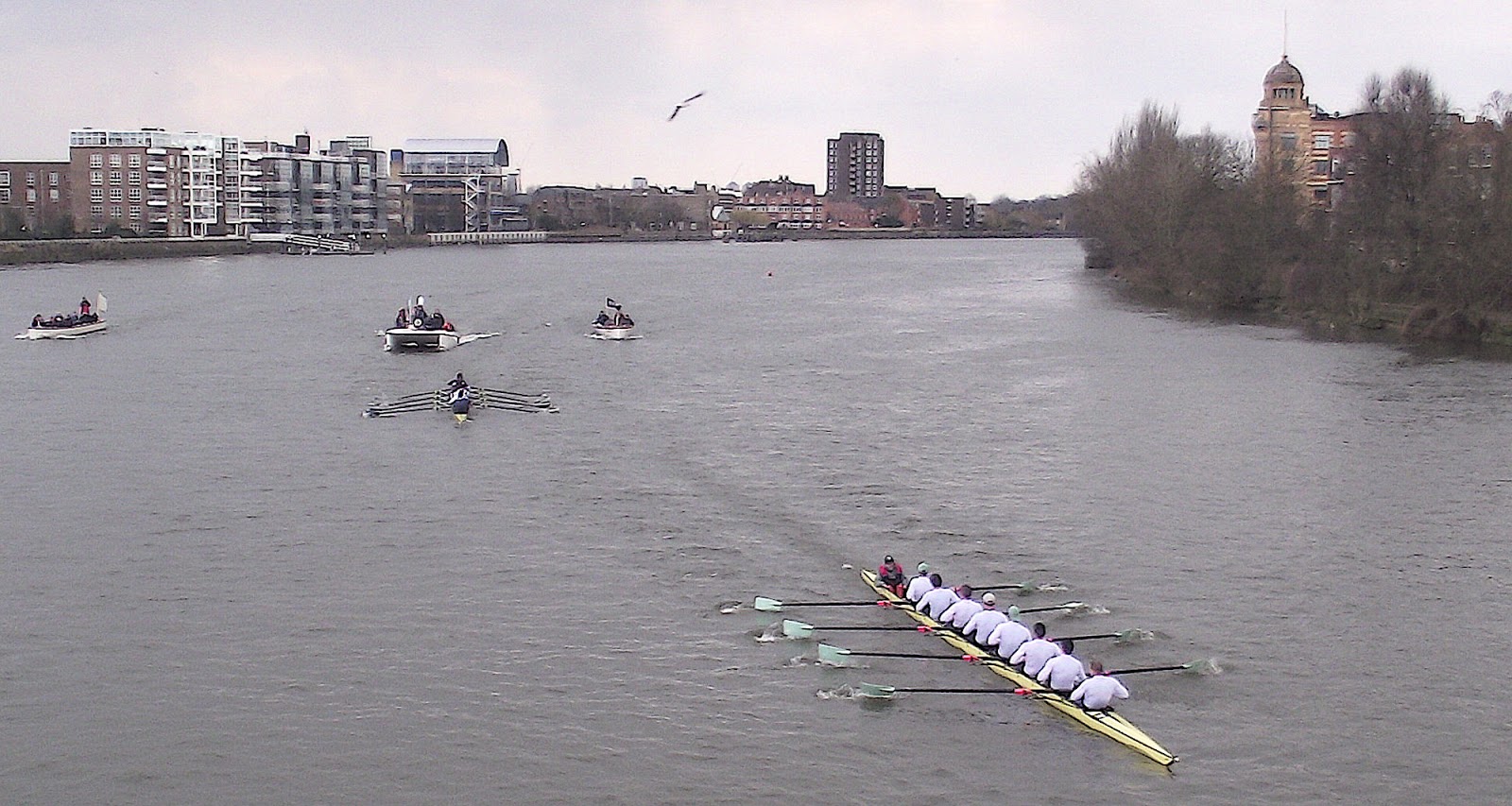 Cambridge has a clear lead over Oxford as the 18th Veterans’ (Masters’) Race approaches Hammersmith Bridge.