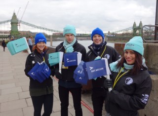 In Hammersmith, Chelsey, Joe, James and Rachel encourage passers-by to be prepared and take part in the cheering during the race.