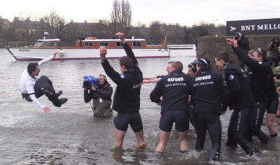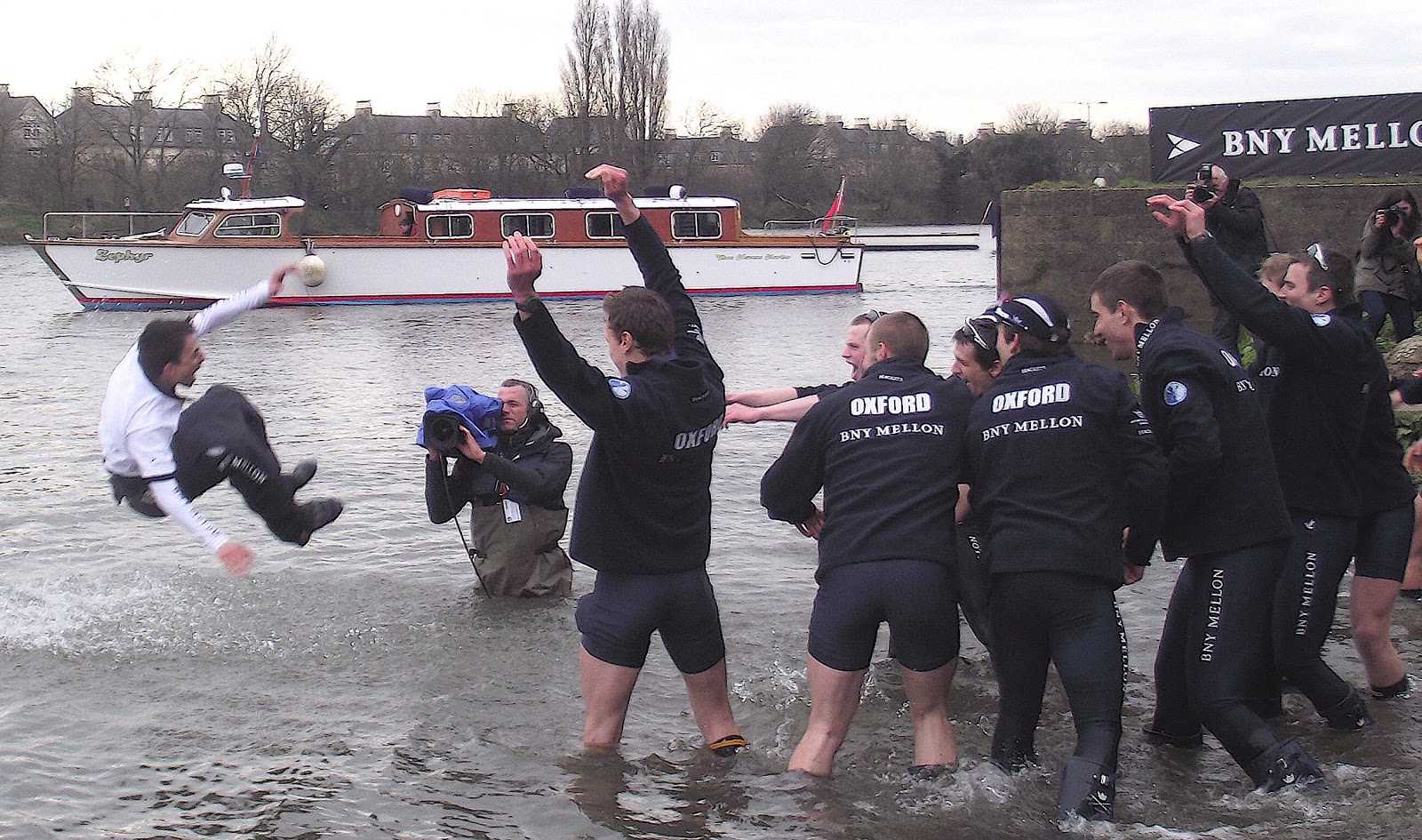 The winning cox receives the traditional ducking from his apparently grateful crew.