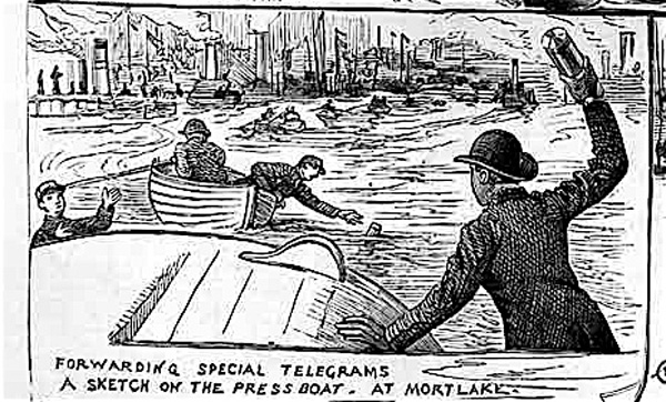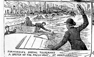 This 1883 print shows how dispatches written on the press boat would be put into watertight containers and thrown into the water to be picked up by small rowing boats and taken to a telegraph office….
