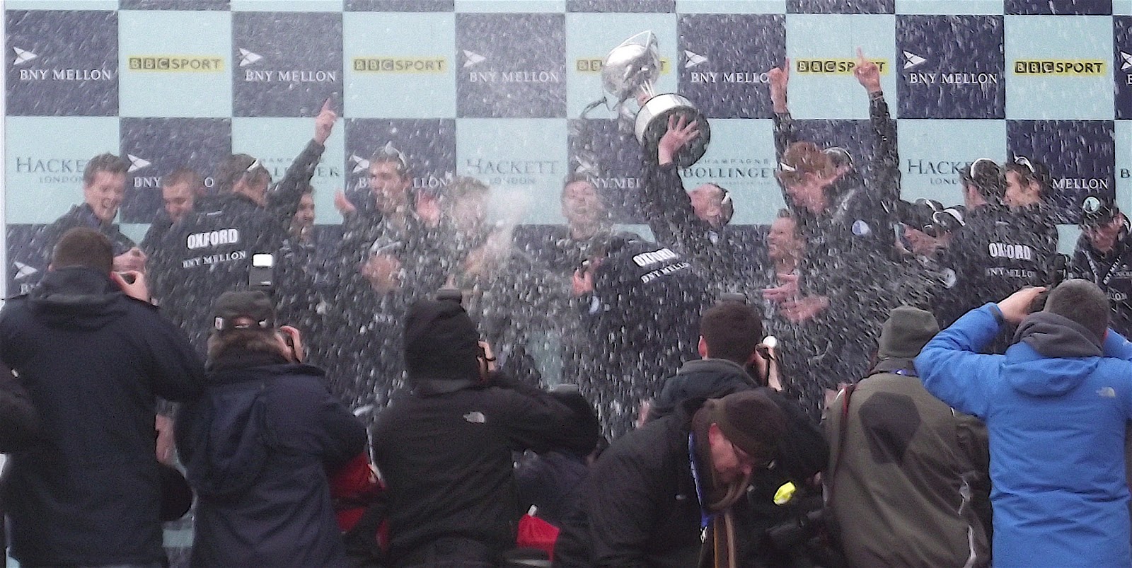 Champagne fills the air as Oxford receive their medals and the race trophy.