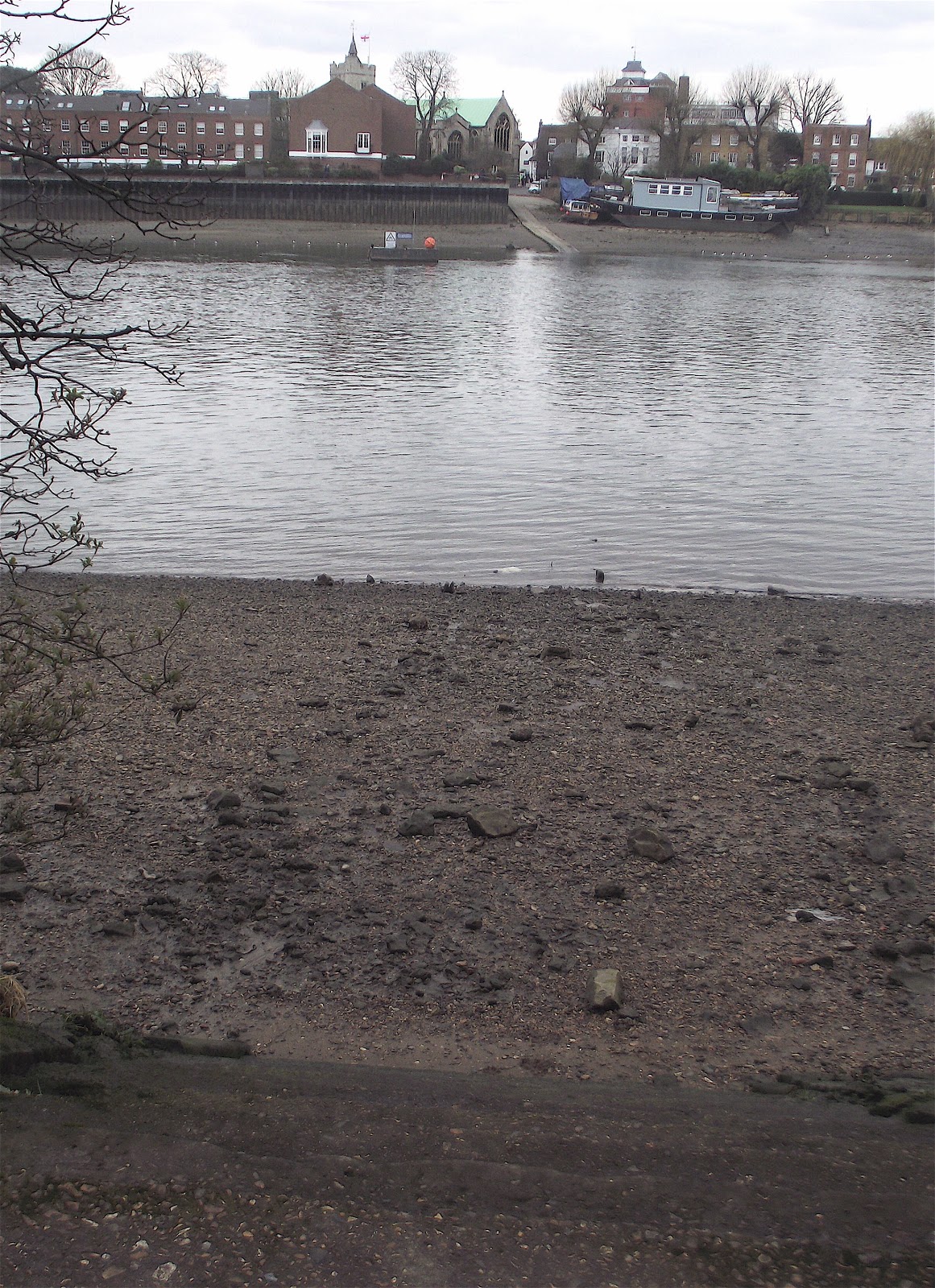 Cycling along the towpath from Putney to Mortlake, I passed Chiswick Steps. It struck me that this simple and uninteresting concrete construction would soon receive its annual but brief moment of fame when it would be mentioned as one of the timing points in the race. The record to here is 9 minutes and 58 seconds. The steps are from the days when there were no nearby bridges over the river and watermen would row people across to Chiswick Church.