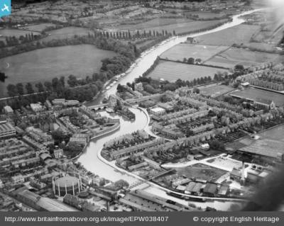 Actually I think I’ve got it now, the view is looking down stream from Folly Bridge, so Christ Church meadows are top right, the line of trees bordering the meadows at the top is the Cherwell, you can make out both the old course and the New Cut of the Cher, opposite the New Cut the solitary building on the South Side of the river is the OUBC boathouse and head quarters, and top of the picture is the dog’s leg in the river I’ve always understood to be ‘The Gut’. Donnington Bridge must be just out of frame at the very top.