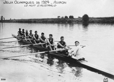 The crew travelled to France with the rest of the Australian Olympic team and on arrival they had to row their boat 37 miles (60 km) to their training camp. It is not surprising that the crew underperformed at the Games: on the day of their heat, in which they finished second to Italy but ahead of Spain, they rowed their boat 26 miles (42 km) from their boat house to the course on the River Seine. In the repêchage they finished third behind Canada and Argentina, but ahead of Belgium. Canada went on to win the silver medal behind the USA crew from Yale. Dr. Benjamin Spock, seven-seat in the victorious USA crew and his 1956 letter to ‘Rusty Wails’ comparing the 1924 crew with that of 1956 was the subject of a six-part article on HTBS in May 2011.