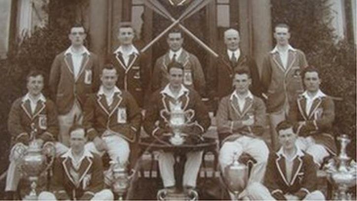 City Of Derry Boating Club with the 1924 Tailteann Games Trophy. The victorious Derry eight was: R. A. Coulter (Bow), J. N. Brownlow (2), K. P. Donegan (3), D. R. Keown (4), E. G. Biggar (5), V. S. Ward (6), T. D. Ward (7), R. S. Bolton (Stroke) and W. Smith (Cox).
