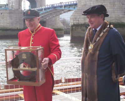 The Tower of London. On the right is the Resident Governor of The Tower and Keeper of the Jewel House, Colonel Richard Harrold, and one of his ‘Yeoman Warders’. The latter are commonly known as ‘Beefeaters’ but officially are ‘Yeomen Warders of Her Majesty’s Royal Palace and Fortress the Tower of London, and Members of the Sovereign’s Body Guard of the Yeoman Guard Extraordinary’. Governor Harrold is presented with the Stela by Paul Ludwig in his capacity as Queen’s Bargemaster.