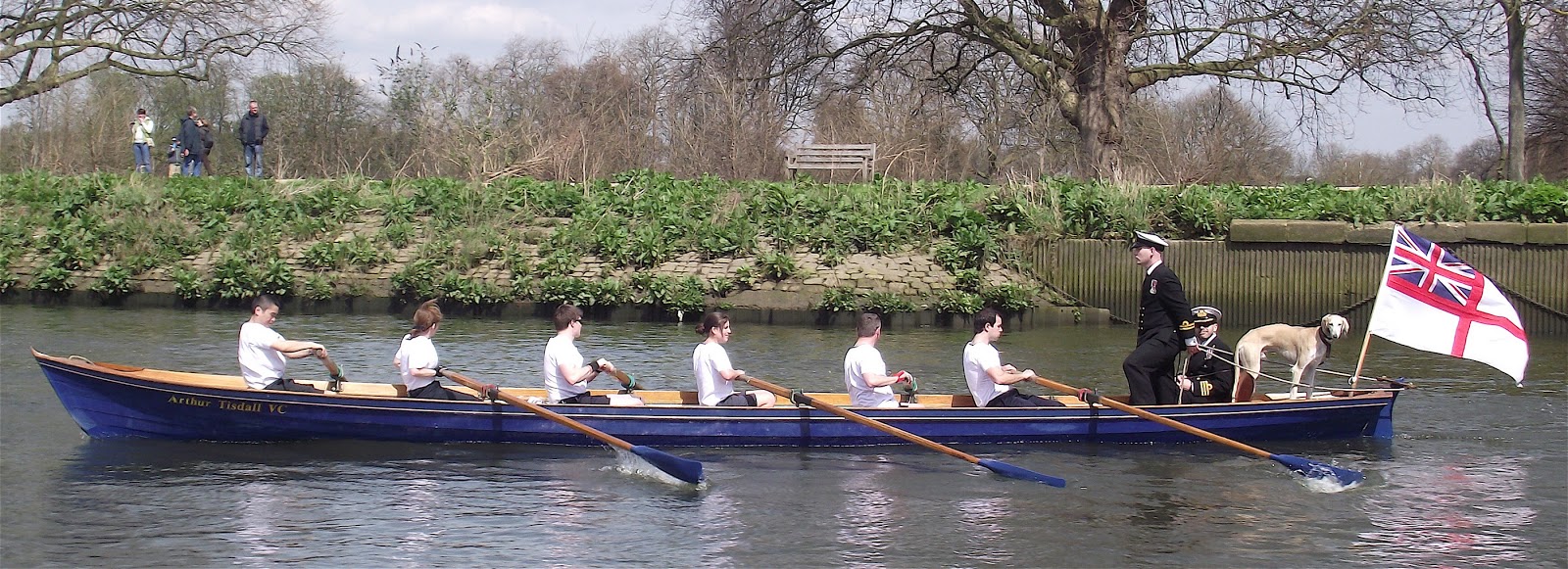 A cutter from the Royal Naval Reserve shore establishment, HMS President. It is the only boat in the flotilla that is entitled to fly the ‘White Ensign’ of the Royal Navy. Six naval ratings provide the power, a Lieutenant does the steering and a Commander and a dog provide the dead-weight. The canine is part of a theme of ‘dogs in boats’ on HTBS. This is from June 2012 and this is from March 2013.