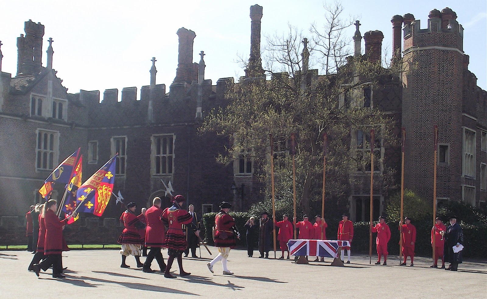 Hampton Court: On the left is a procession from the Palace bringing the Stela to the Queen’s Bargemaster, the Queen’s Watermen and representatives of the Watermen’s Company, all on the right.