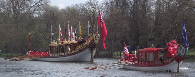 The Gloriana is followed by the Royal Shallop Jubilant. Bob Crouch, a Doggett’s winner, past master of the Watermen’s Company and past Queen’s Bargemaster writes about shallops on the Jubilant Trust website.