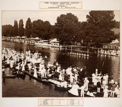 The image in fine condition and measuring 70 by 96cm, 27½ by 37¾ in, mounted with original printed title reading THE OLYMPIC REGATTA, HENLEY, JULY 31st 1908, FINAL, LEANDER v BELGIUM, and with a printed legend beneath detailing the crews and result, under glass in original wooden frame, overall 101 by 124cm, 40 by 49in.