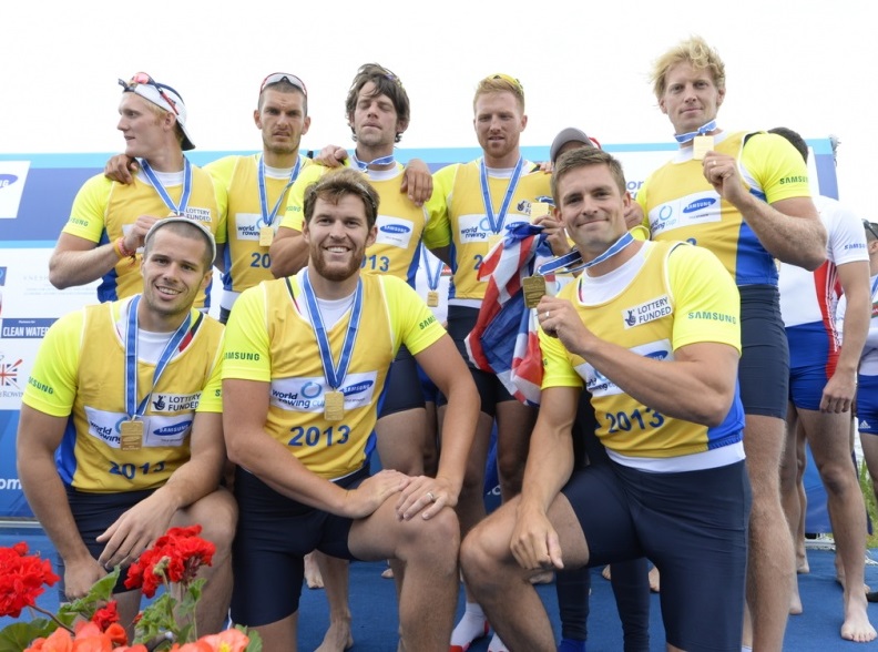 The Great Britain men’s eight crew on the medal podium at RWC II Eton Dorney. Coxswains should really stand at the front! (Photo British Rowing)