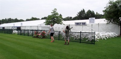 The view from Henley Bridge. The finish is in the background and the boat tent area is in the middle ground. The floating pile driver in the foreground will soon be removed.