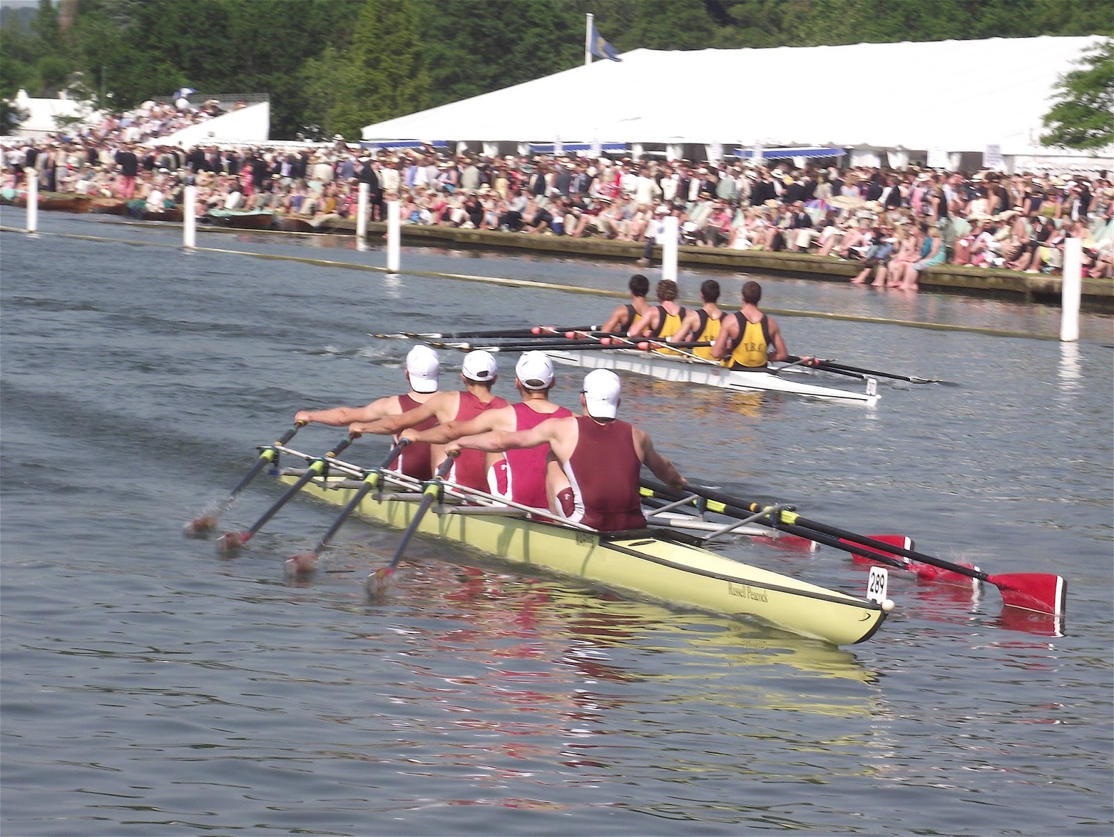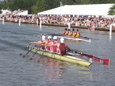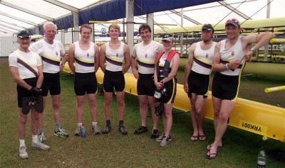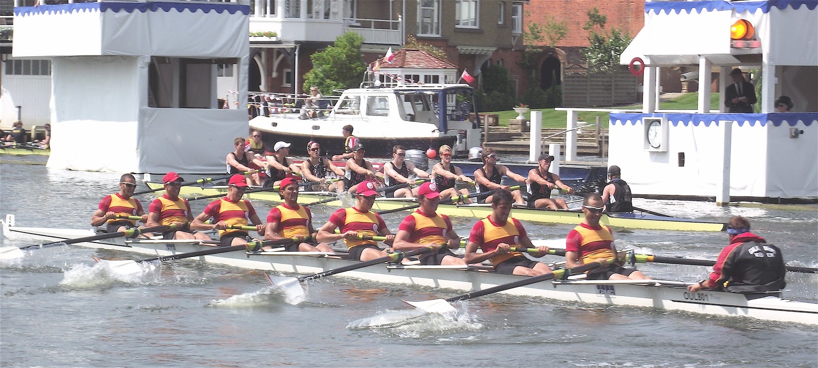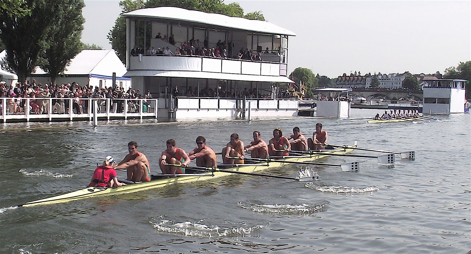York City RC marked their 150th Anniversary by rowing over the course during the Friday Tea Interval. The crew was made up of two veterans, two juniors, three from the club’s 2007 Britannia winning crew and the club captain. The gentleman on the left is Dick Gradley, who is 81. He started rowing at he age of 65 and was captain of the British gymnastics team at the 1960 Rome Olympics. He still works as a fitness instructor. A picture of Dick in his younger days is here. Until I met Mr Gradley, I thought that Bond or Murray were the most remarkable athletes at the regatta.