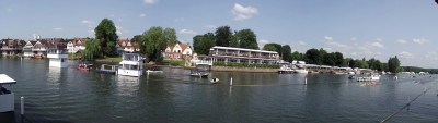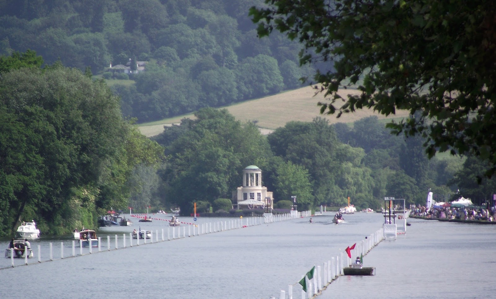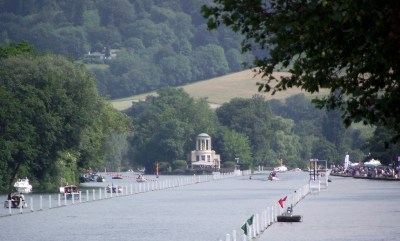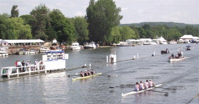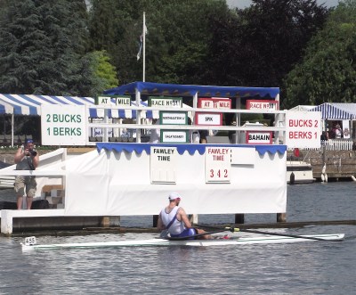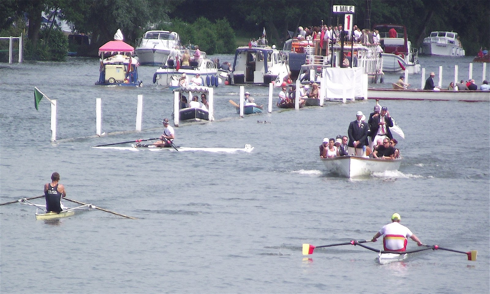 After a poor start, Britain’s Alan Campbell won his heat of the Diamonds (Open M1x) by 3 lengths over Bozhilov of Bulgaria. In the background, Mahé Drysdale crosses the course on his way to the start of his heat. Henley must be the only international regatta where the competitors have to share the water with a floating ice cream stand (top left). In addition there are Mississippi River Boats, jazz bands, Elvis impersonates, gondolas and flocks of geese to contend with. However, things are better than they were in 1914.