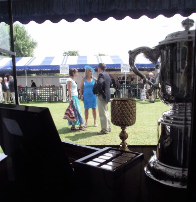 The trophies for the Diamonds and the Prince of Wales displayed in the prize tent frame some visitors to the Stewards’ Enclosure.
