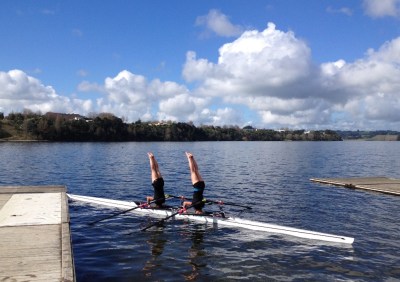 Like the rest of the international rowing elite, the Rowing New Zealand Women’s Lightweight Double Sculls, Julia Edward and Lucy Strack, are on their way to Chungju-si, South Korea, for the 2013 World Rowing Championships, held between 25 August and 1 September. They will have their first heat on 25 August. Before leaving Lake Karapiro Rowing High Performance Centre, the ladies were practicing balancing …. Fine job, I say!