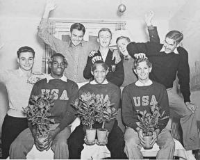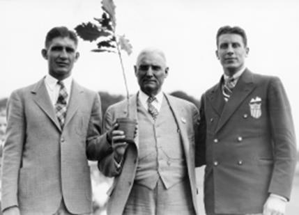 Another American, decathlon champion Glenn Morris, chose to donate his oak tree to his alma mater, Colorado State College of Agriculture and the Mechanic Arts (now Colorado State University). The above photograph shows Morris (pictured right) at the 1936 “Presentation of Oak” ceremony with College President Charles A. Lory (centre) and William Wagner, a fellow athlete.