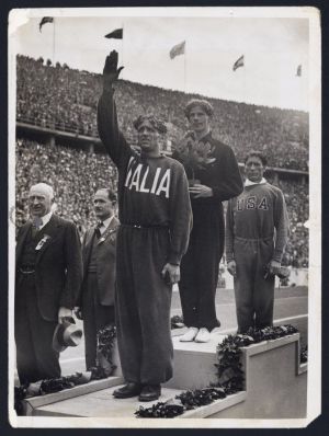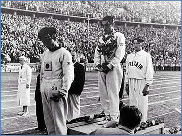 In the first, he salutes during the presentation of his gold medal for the long jump, after defeating Germany’s Lutz Long (silver medallist on the right) and Japan’s Naoto Tajima (bronze medallist on the left).