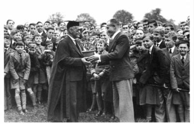 Another photograph accompanied the above article: it is rather less well known but just perfect for this blog post. It shows Jack Beresford handing over the oak sapling to Mr Humfrey Grose-Hodge, Headmaster of Bedford School. Whilst most of the oak saplings have died or have been felled, one has to wonder what became of the terracotta pots that they were originally presented in.