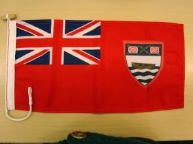 A chief is a horizontal band across the top of the shield and its colour is the second mentioned, in this case blue. On the chief are a pair of oars crossed (saltierways) and their colour is the third mentioned, vis gold. These oars are between two cushions coloured the first colour mentioned, vis white. The cushions are supposed to represent what a passenger would sit on while being transported in a boat. The supporters are a dolphin on either side of the shield and their colour is supposed to be as they are in nature (proper.)