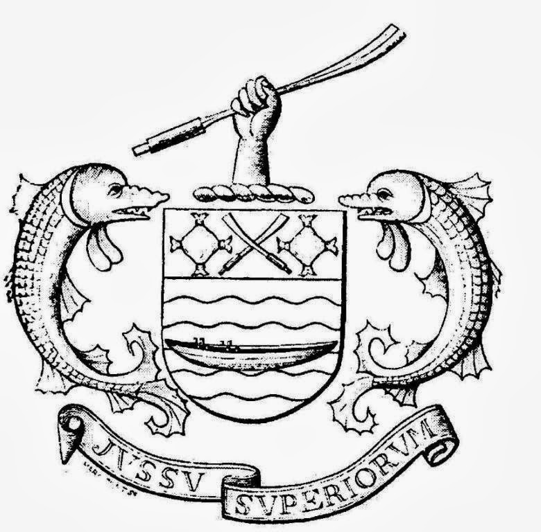 Their arms, barry wavy argent and azure, a boat or; on a chief of the second, a pair of oars saltierways of the third, between two cushions of the first, are supported by two dolphins proper; the crest is a hand holding an oar and their motto is Jussu superiorum, being ever at the command of their superiors”