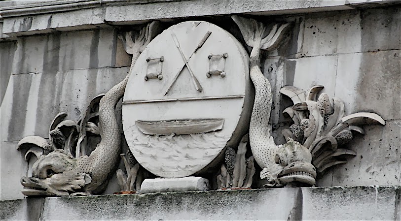 The present Watermen’s Hall dates from 1780. Its exterior sports a fairly simplified version of the arms. Unlike with some depictions, the oars do look like what they are trying to represent and the boat is a reasonable delineation of a waterman’s wherry. The sculptor has not attempted a ‘heraldic’ depiction of water but has gone for a ‘realistic’ image. Also, while most of us think of dolphins as rather gentle creatures, these marine mammals look ready to attack anyone who comes too close.
