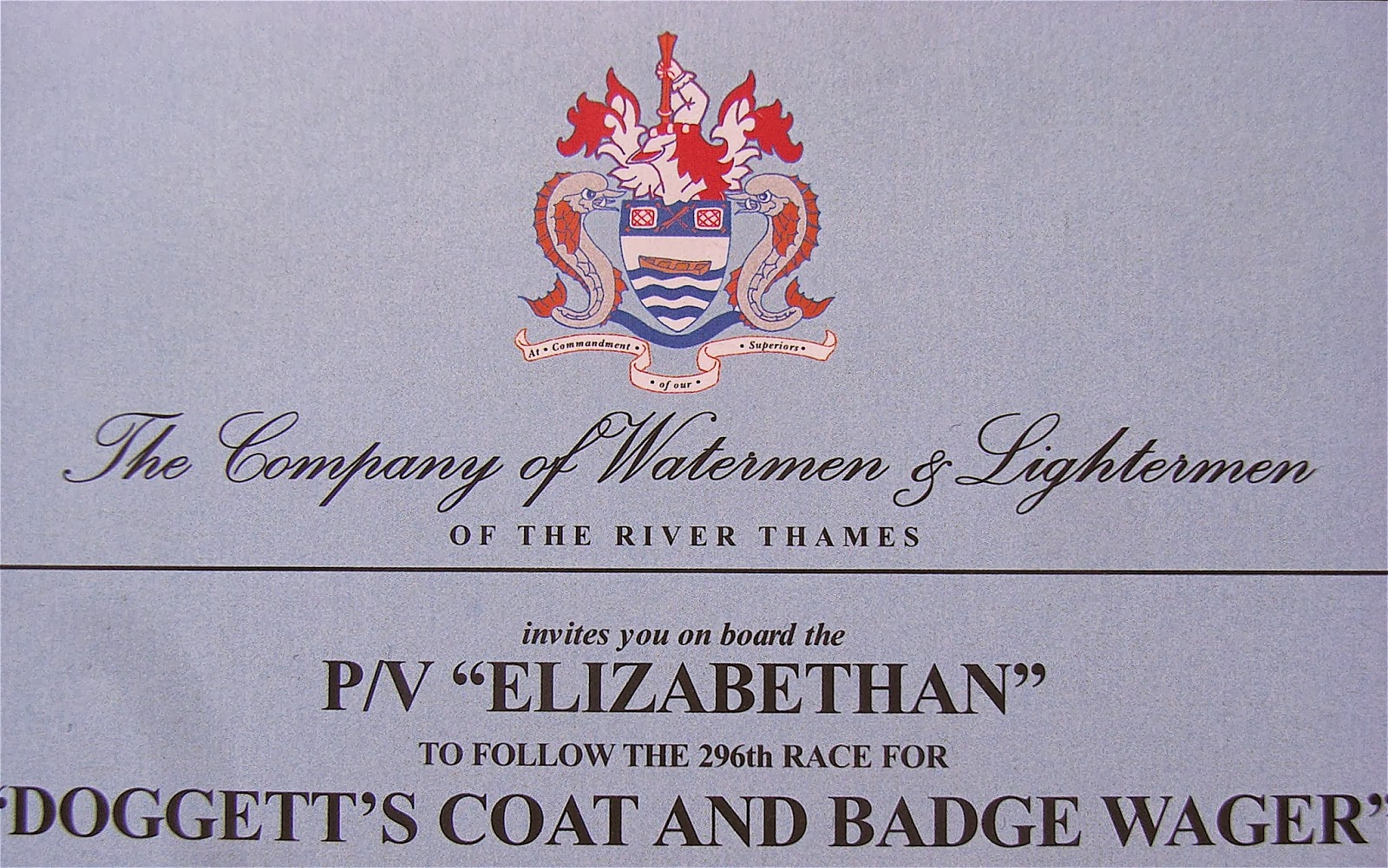 The version of the arms printed on this invitation to the Doggett’s Coat and Badge is used in most of the current publications produced by the Watermen’s Company. Both the single and the crossed oars do not look as though they would be much help in propelling a boat along, the dolphins have clearly come from a castle in Transylvania and the knight’s helmet seems to have morphed into a large angry bird.