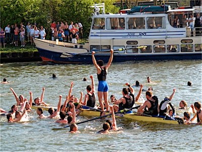 A glimpse into the fascinating history of Dutch student rowing was given by Rob Van Mesdag. Before the 1939 – 1945 War, Dutch freshmen had to become what were called ‘foetuses’ and undergo harsh initiations before joining student boat clubs. The big event in Dutch student rowing then and now is the regatta known as ‘The Varsity’, founded in 1878. It is an event full of tradition such as the members of the winning university swimming out to the victorious boat and (according to this) throwing coxswains at frozen chickens. Post Varsity celebrations are famously drunken affairs and there seems to be a large amount of nudity. A more explicit picture is here but I am pleased to see that these chaps follow Henley rules and keep their ties on. Click on these thumbnails for more health and safety violations.