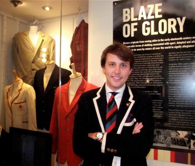 Jack Carlson in front of the museum’s current exhibition of rowing blazers.
