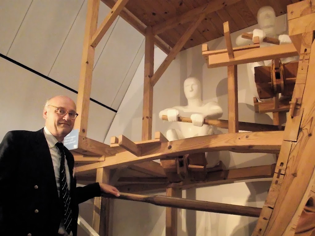 Professor Boris Rankov with the museum’s mock-up of a section of a trireme (from the Latin meaning ‘three banks of oars’).