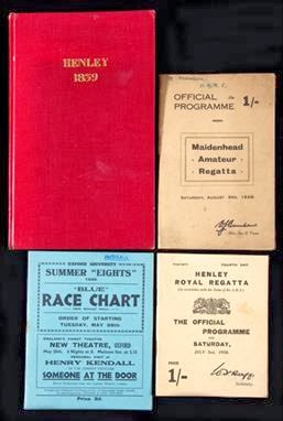 Rowing programmes, Durham Regatta 22.6.1938; Maidenhead Amateur Regatta 3.8.1929; Henley Royal Regatta 2.7.38 & 5.7.52; Oxford University Summer Eights 26.5.1936, 22.5.1937 & 24.5.46; Oxford v Cambridge Boat Race 30.3.1946; Oxford University Torpids’ Race Card 21.2.1939; the lot also including a 12-page booklet Henley 1839, red cloth boards; and an Ouse Amateur Sailing Club Regatta at Denver (11). Estimate: £130 – £160