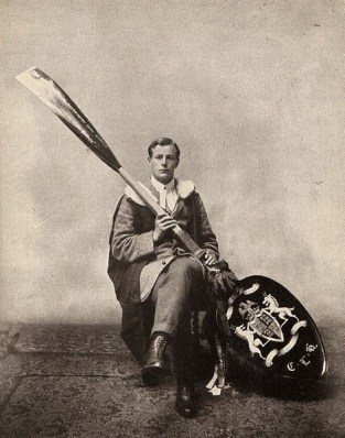 Cuthbert Lempriere Holthouse, oarsman of Lady Margaret Boat Club and student of St John’s College, Cambridge, with his mock prize, the ‘Wooden Spoon’, which showed everyone that he was the last one on the 1909 honours list at the Mathematics Tripos. On Holthouse’s left is a shield with St John’s College Coat of Arms.