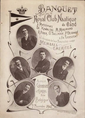The defeat of the Belgians in the final of the Olympics, which earned several of their members a silver medal, did not merit a mention on the menu of the Banquet held by Royal Club Nautique de Gand to celebrate the club’s achievements during the 1908 season. Six men were elected as ‘membres emerites’ and from this we can identify that Messrs Kowalski, Morimond, Poma, Taelman, Veirman and Vergucht were ‘Club’ men.