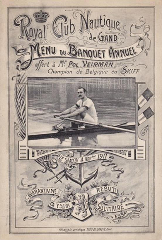 Polydore Veirman, the six-man of the 1907, 1908 and 1909 crews featured on the cover of the 1911 menu after claiming the sculling championship of Belgium. He also took a silver medal in the single sculls at the 1912 Olympic rowing in Stockholm.