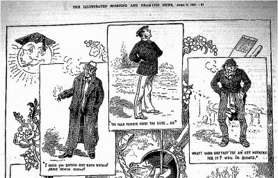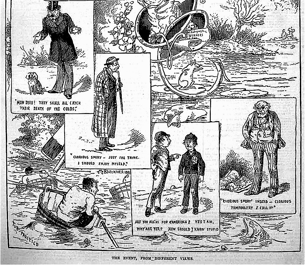 The cartoon of 1881 that prefaced my piece on the University Boat Race yesterday (‘Different Views of the Event’) did not reproduce very well. Here it is again, with the captions reproduced and the picture in two parts to make it clearer.