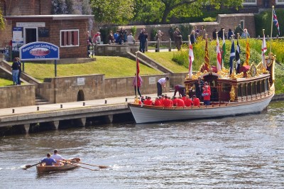 A banner announcing the arrival of the Royal Barge carrying George I (looking very well for a man who has been dead for 287 years).