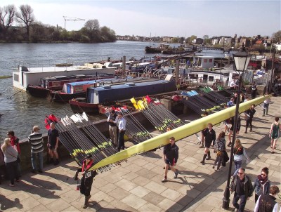 Going afloat at the 2014 Head of the River Race in London. All the oars shown are Concept2. The boat is German but that is another story.