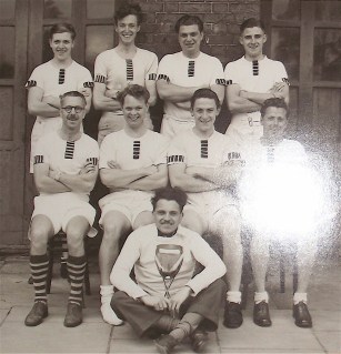 The winning crew in Junior Eights at the 1950 Hammersmith Amateur Regatta. Hill is top right. (Excuse the camera flash.)