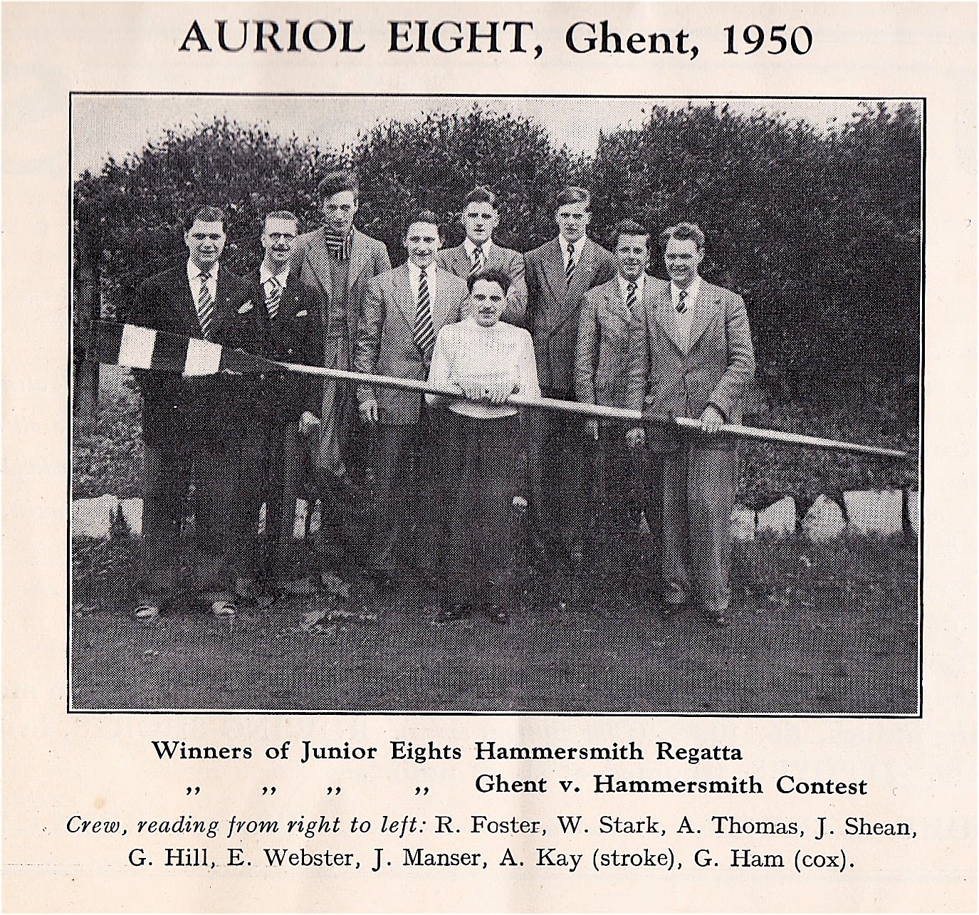 The ARC crew for Ghent pictured in Rowing Magazine No. 7, Spring 1950. It was Tony Kay, the stroke, that Hill boxed in the Auriol clubroom. History does not record what the dispute was about though I could imagine that Hill coveted the stroke seat.