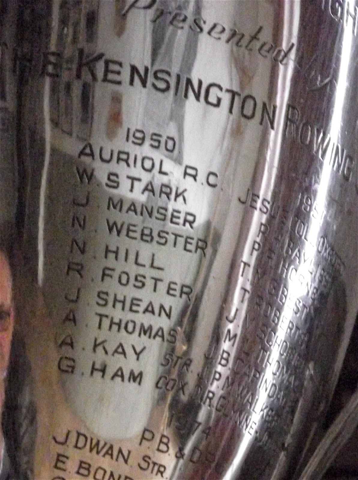 The winning crew in Junior Eights at the 1950 Hammersmith Amateur Regatta. Hill is top right. (Excuse the camera flash.)