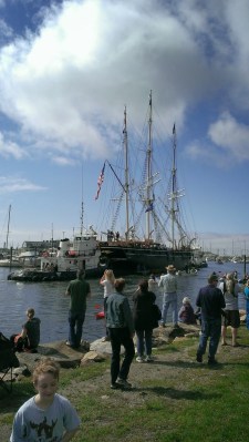 For days the weather forecast looked dreadful for this morning, pouring rain, strong winds, and unruly sea. But the rain stopped early, and in time for her departure, the sun had come out, the dark clouds had moved away, and it was just beautiful – just look at those pictures for this entry. Thousands and thousands of people had gathered along the Mystic River to see the ‘old girl’ off. Following her was a flotilla of vessels, both from the Museum and private boats. Among them were five of the newly built whale boats that have been built for her voyage.