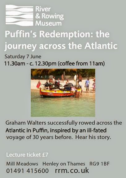 Last year in September 2013, the River & Rowing Museum in Henley-on-Thames presented Graham Walters, who gave a thrilling talk on an incredible journey across the Atlantic in the fifteen-foot Puffin, successfully completing an ill-fated voyage that began 30 years earlier when the two-man crew, David Johnstone and John Hoare, disappeared after 106 days at sea in an attempt to row across the Atlantic. Due to popular demand, on Saturday 7 June, Walters will be back at the River & Rowing Museum in Henley to repeat his talk, which is called “Puffin’s Redemption: The Journey across the Atlantic”. The talk is between 11.30 a.m. and ca. 12.30 p.m. (coffee from 11 a.m.) and the ticket price is £7.