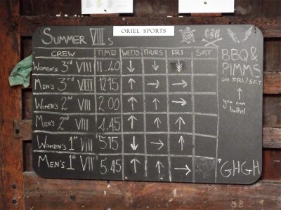 A chalk board by the Porters’ Lodge records Oriel’s progress up to the final day. The final results were as follows. The Women’s 3rd VIII did spectacularly badly, they won ‘spoons’ (i.e. were bumped every day) and on the Friday were ‘overbumped’ (i.e. bumped by a crew that started three boats behind them). The 3rd Men went up two places and the 2nd Women up three. The 2nd Men bumped every day and so won blades, finishing the top 2nd VIII. The 1st Women eventually stayed level, 12th in Division One, and the 1st Men went Head of the River.
