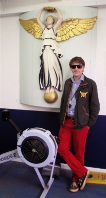 Jack Carlson, coach of the victorious Oriel Men’s First VIII, stands by the figure of Victory which once adorned the former Oriel college barge but is now in the club boathouse. The sunglasses are to provide some relief from hay fever but, even if this were not the case, Jack is cool enough to wear shades indoors. Just in the last year, while continuing his PhD he has coxed winning crews at Henley Royal, Canadian Henley and the Head of the Charles, plus he has published a handsome book on rowing blazers (more about his book in a HTBS post coming soon).