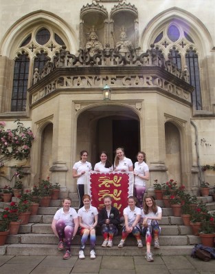 Oriel Women’s Third VIII: Bottom of the River. They are pictured in front of the portico of the (dining) Hall. The stonework carving ‘REGNANTE CAROLO’ (‘Charles, being King’) commemorates the construction of the building during the reign of Charles I.