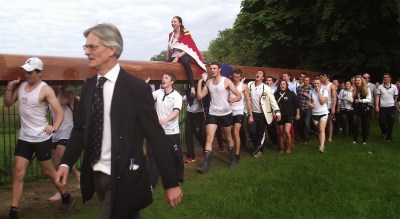 Cox Olivia Cleary is carried high alongside Christ Church Meadow. The college flag she is wearing bears the three lions of Edward II. The slightly worried looking gentleman in the blue blazer is the Oriel College Bursar, Mr. Wilf Stephenson, who has the role of ‘responsible adult’ and attempts to see that the college does not get sued as high spirited students wave a 64 foot boat around in public.