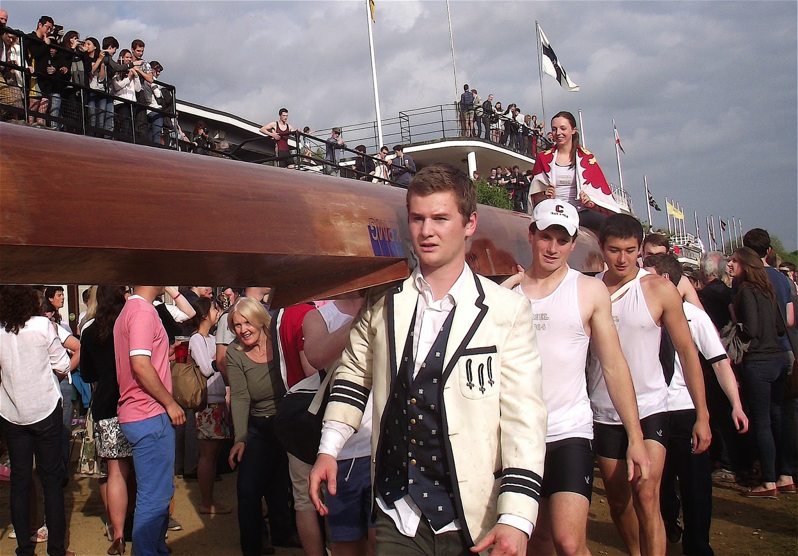 The college boat club that goes Head of the River carries out a remarkable tradition. The winning cox, wrapped in the winning college flag, is carried on an old wooden eight from the boathouse, through the City of Oxford and into college. Members of college follow, noisily chanting and banging on the boat to ensure that everyone knows who is Head of the River. The man nearest the camera is wearing an Oriel College Boat Club blazer. The three ostrich feathers are the badge of The Prince of Wales (though which of the Princes it refers to is disputed). The three rings on his sleeve indicate that he has rowed in a 1st Summer VIII.
