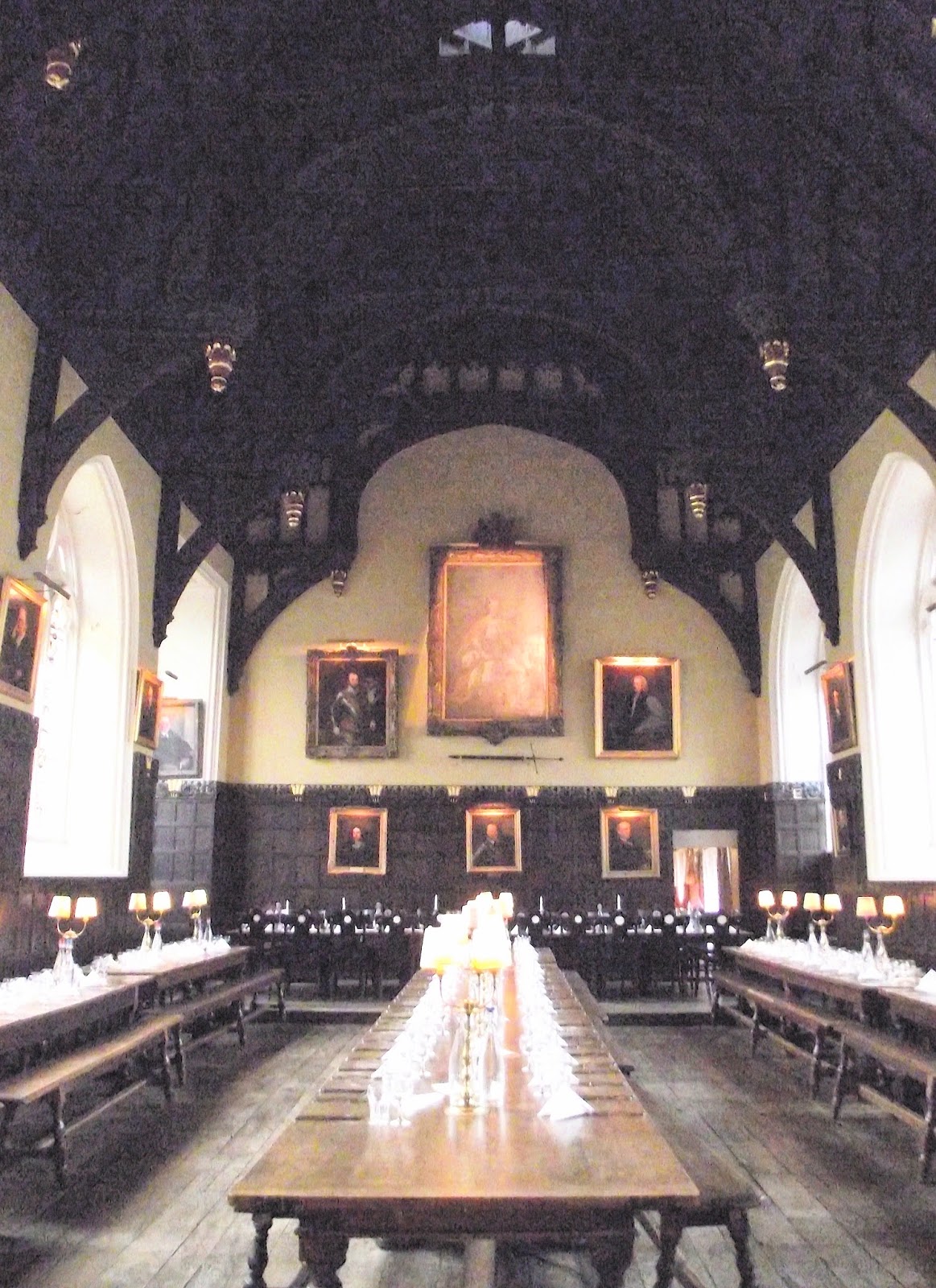 The Oriel College Hall, ready for the Bumps Supper. Completed around 1642, the room has a splendid hammerbeam roof. The large portrait above the High Table is of Edward II (1284 – 1327) who gave permission for the college to be established. The picture to the left of this is of alumnus, Sir Walter Raleigh (1554 – 1618). The place calls to mind a verse from “He Fell Among Thieves” by Henry Newbolt:
