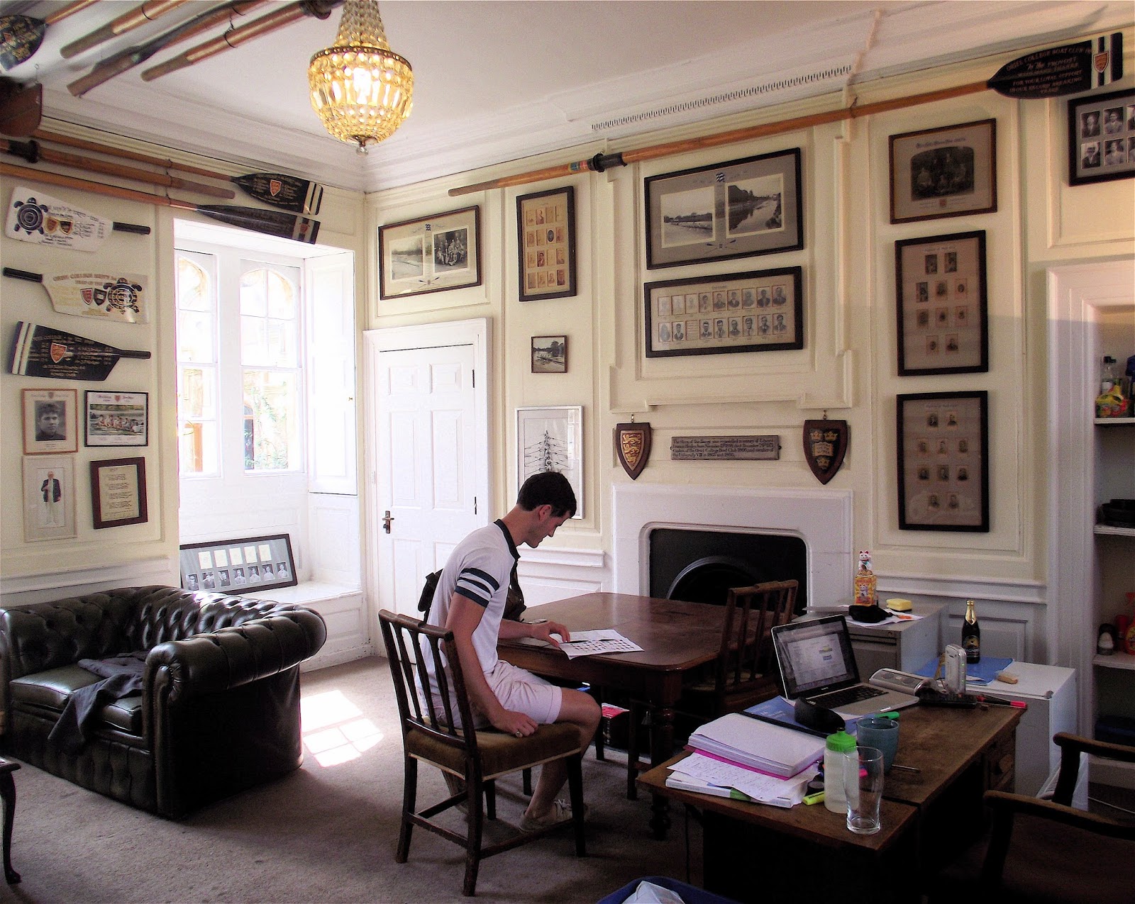 The Boat Club Captain’s sitting room. Calum Pontin, this year’s Captain and ‘4’ in the First VIII, here studies a worthy text. The room is splendidly decorated with Oriel rowing memorabilia. In the past all the rooms in this ‘staircase’ were allocated to members of the First Eight.