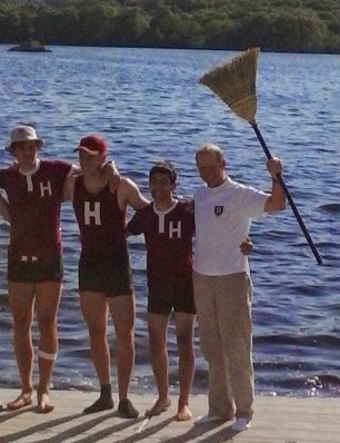 HTBS managed to exchange a couple of words with Harvard’s Varsity cox, Will Hakim, who the previous two years has coxed the JV boat, and who was now wet from having been tossed in the Thames. Happily leaning on the famous broom that comes out from the boathouse after every clean sweep, three victories (four if you count the Friday Coxed Four race for ‘combi crews’), I asked him if there was ever any doubt that his boat was going to win? Will said: ‘No, not really. We were prepared from any attacks from Yale, and we never felt pressured. Charley [Butt] trained us well, and to us there was never any doubt that we would win.’